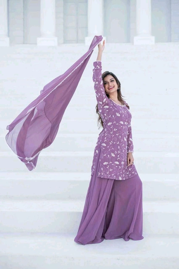 Thread Embroidery Kurta With Wide Flowy Sharara And Duppatta