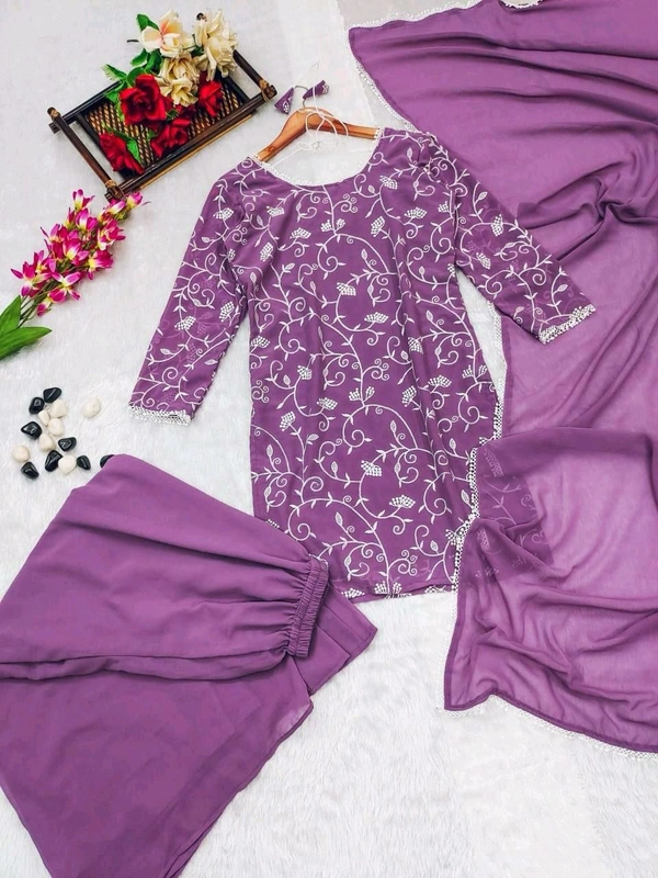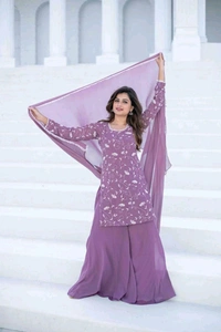 Thread Embroidery Kurta With Wide Flowy Sharara And Duppatta